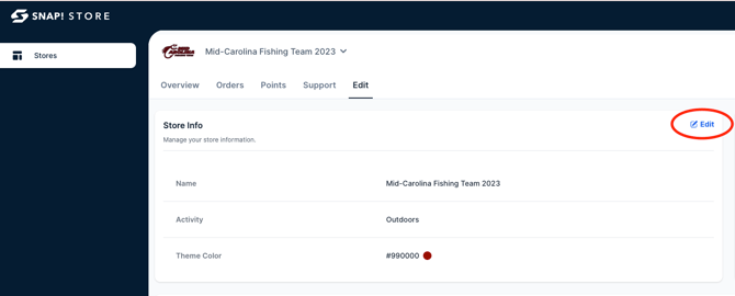 Editing Store Name, Theme Color & Activity Type: To make changes to the store name, theme color of your store site, or activity type, select the edit box next to the 'Store Info' section. It is important to note that changing the activity type & store name does not change the text that will be used on purchases.