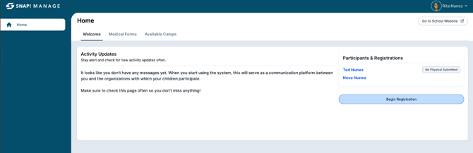 - On the right side of your dashboard you will see a section titled Participations & Registrations. Under this section is your child's name in blue.