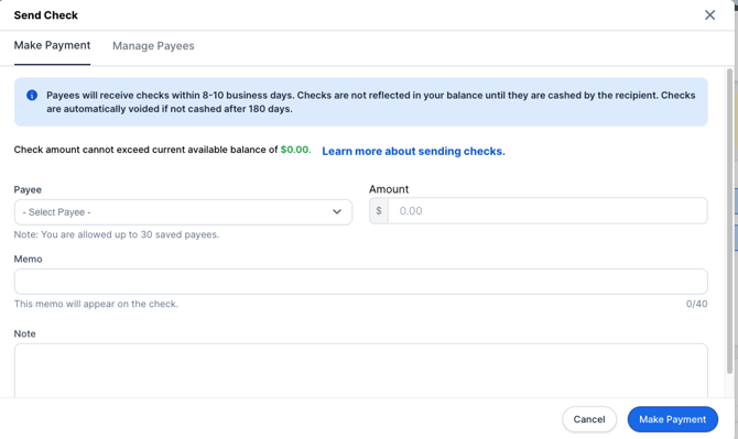 Please note: Funds from the check will not be debited against the respective account until the recipient cashes the check. The transaction will be listed as pending, but funds will not be deducted until the check is cashed. If a check is attempted to be deposited and there are not sufficient funds, the check will fail, and a new check will need to be issued.