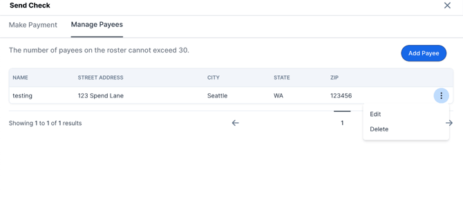 If you need to edit an existing payee's address for Sending Checks navigate to the Program Banking tab. Click the blue Send Check button on the right-hand side of the screen under Transfer. Click Manage Payees, select your payee, and then click the 3 dots next to their name. From there, you can click Edit and update their address.